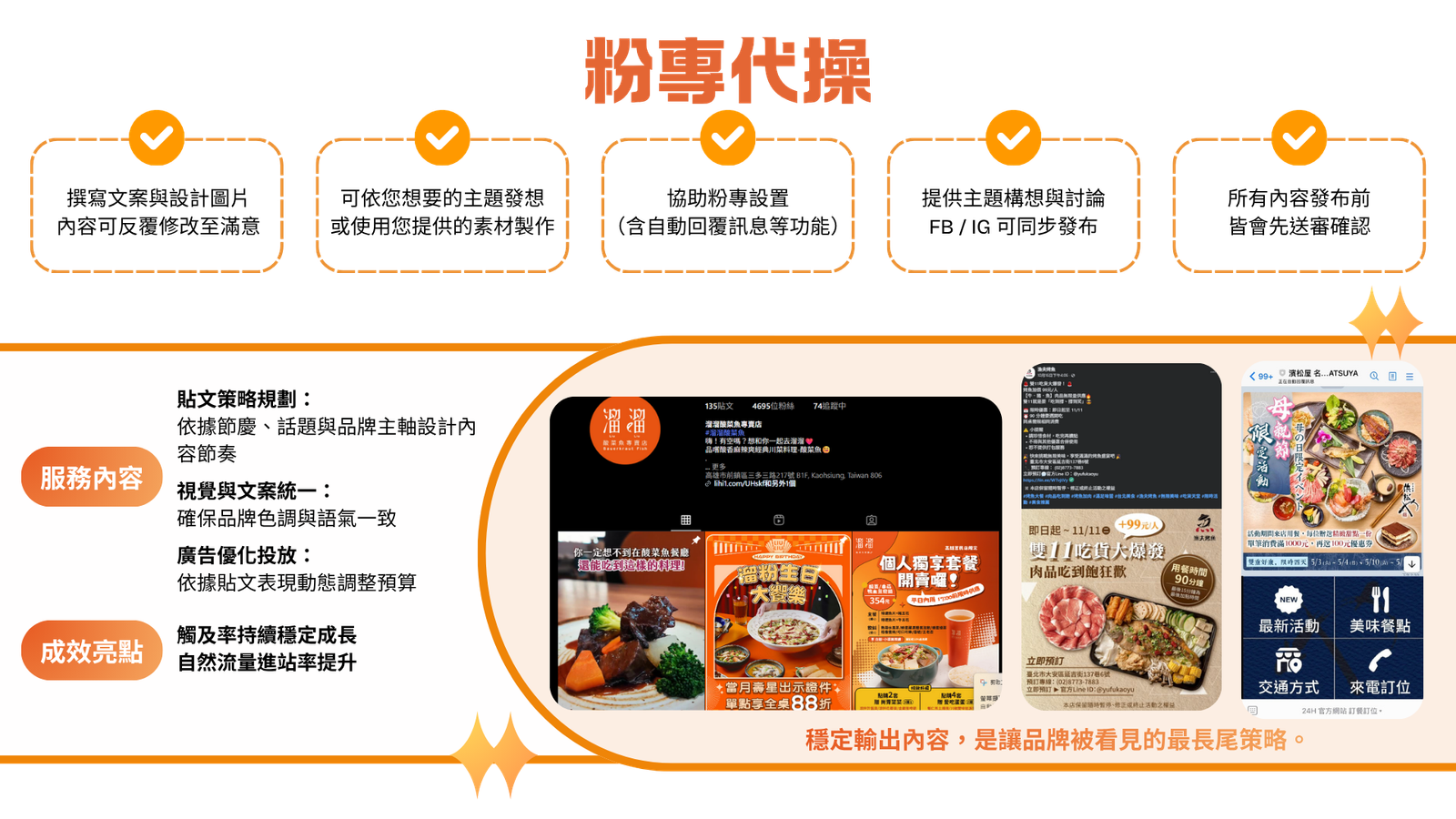 提供內容企劃、貼文撰寫、照片編輯製作,打造穩定互動率。